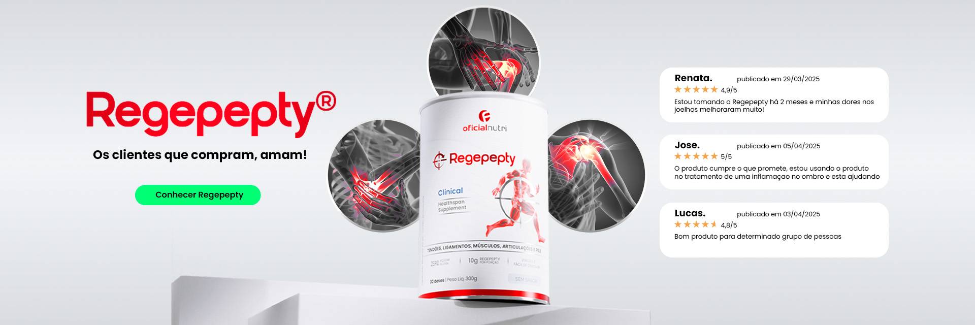 Suplemento desenvolvido com tecnologia patenteada exclusiva de peptídeos bioativos de alta absorção, Regepepty ® age diretamente na prevenção e regeneração dos tendões, articulações, pele e músculos.